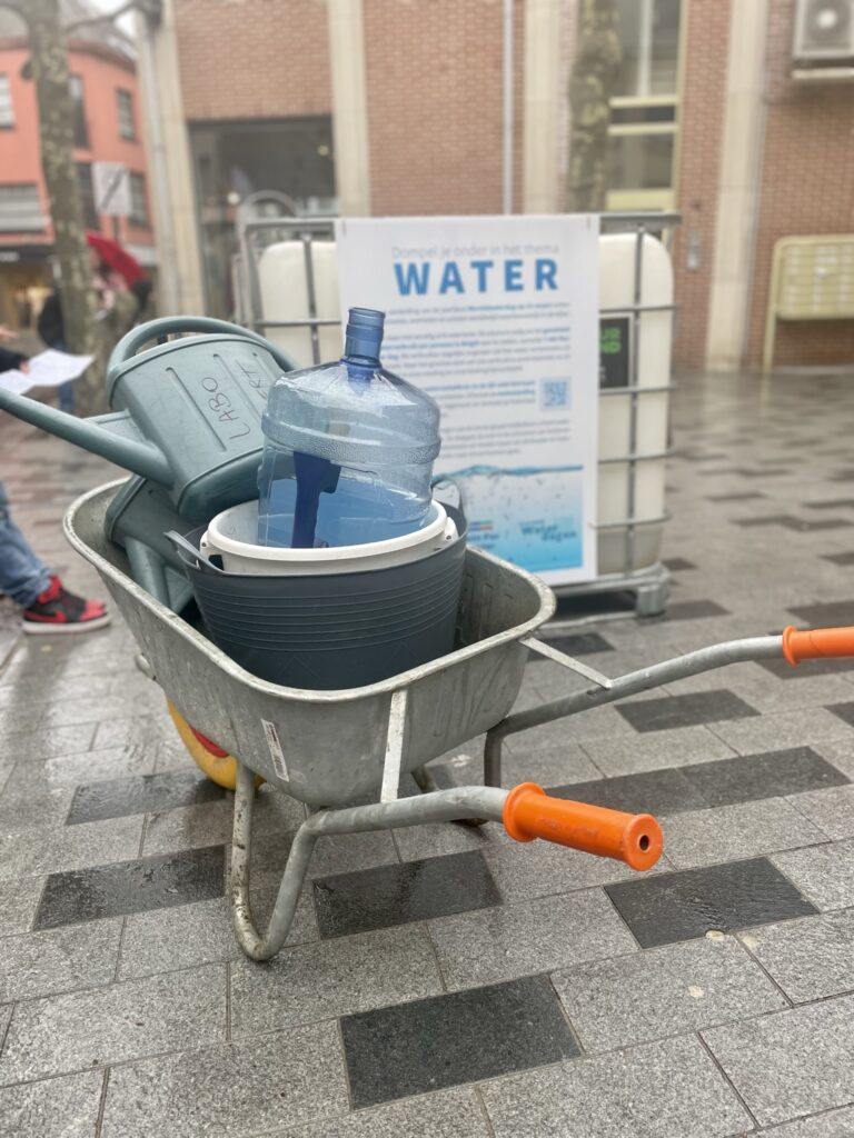 De gemeente en de school sloegen de handen in elkaar op wereldwaterdag. Ze deden een symbolische actie rond waterbewustzijn. Het Waterhuis van Join For Water stond opgesteld in een leeg winkelpand. Op het aangrenzend plein stonden 8 watertanks van elk 1000 liter, waar enkele klassen van het Lyceum het water gingen brengen dat ze in de aanloop naar Wereldwaterdag verzameld en opgevangen hadden op school. Onze collega’s in het Zuiden noemen dit ‘rainwater harvesting’.